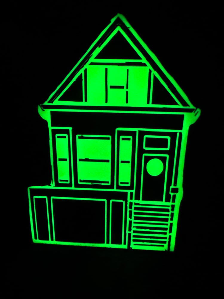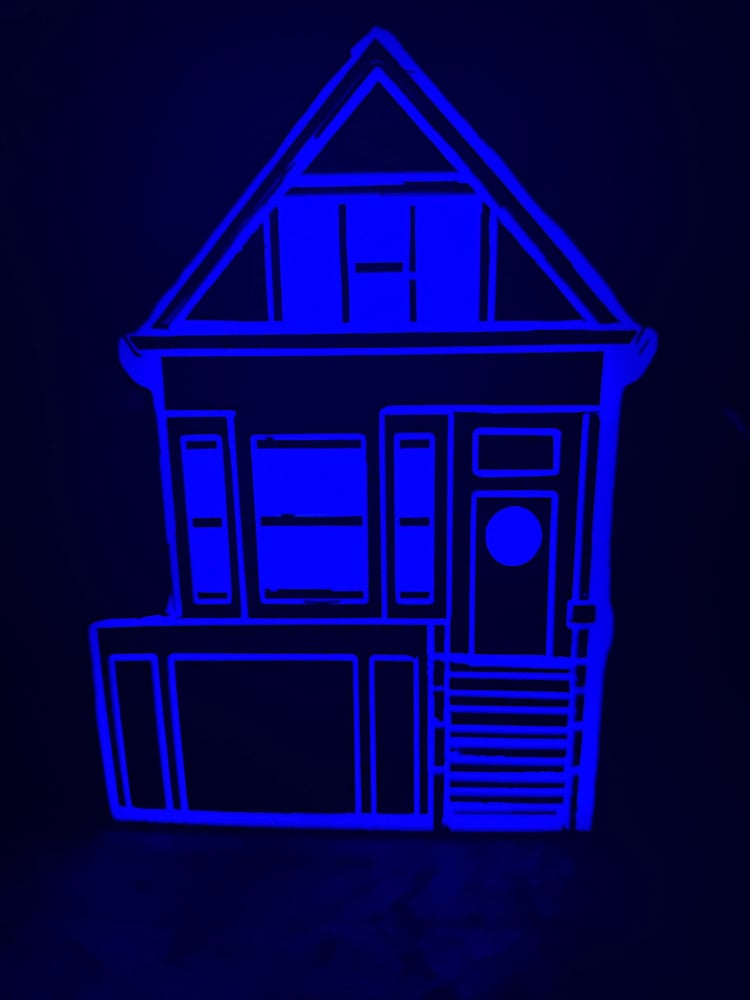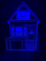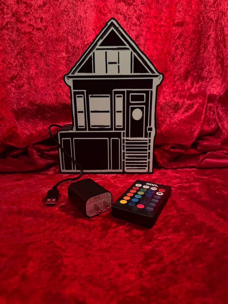 Black House light box with 16 different color options. Product dimensions are 9x6x2. Comes with AC wall adapter and remote.